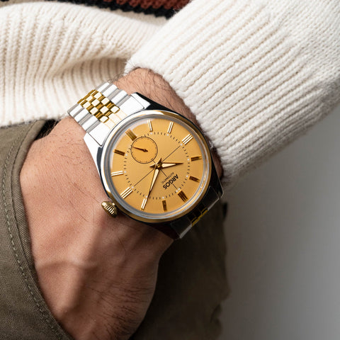 The Argos Apollo III elevates your everyday elegance. Its automatic movement ensures effortless precision, while the vibrant neo-vintage dial and luminous accents captivate the eye. The Italian suede strap with the butterfly buckle or the 5 Row Solid Link Jubilee Bracelet offer a touch of timeless sophistication, complemented by the virtually scratch-proof sapphire coated crystal.