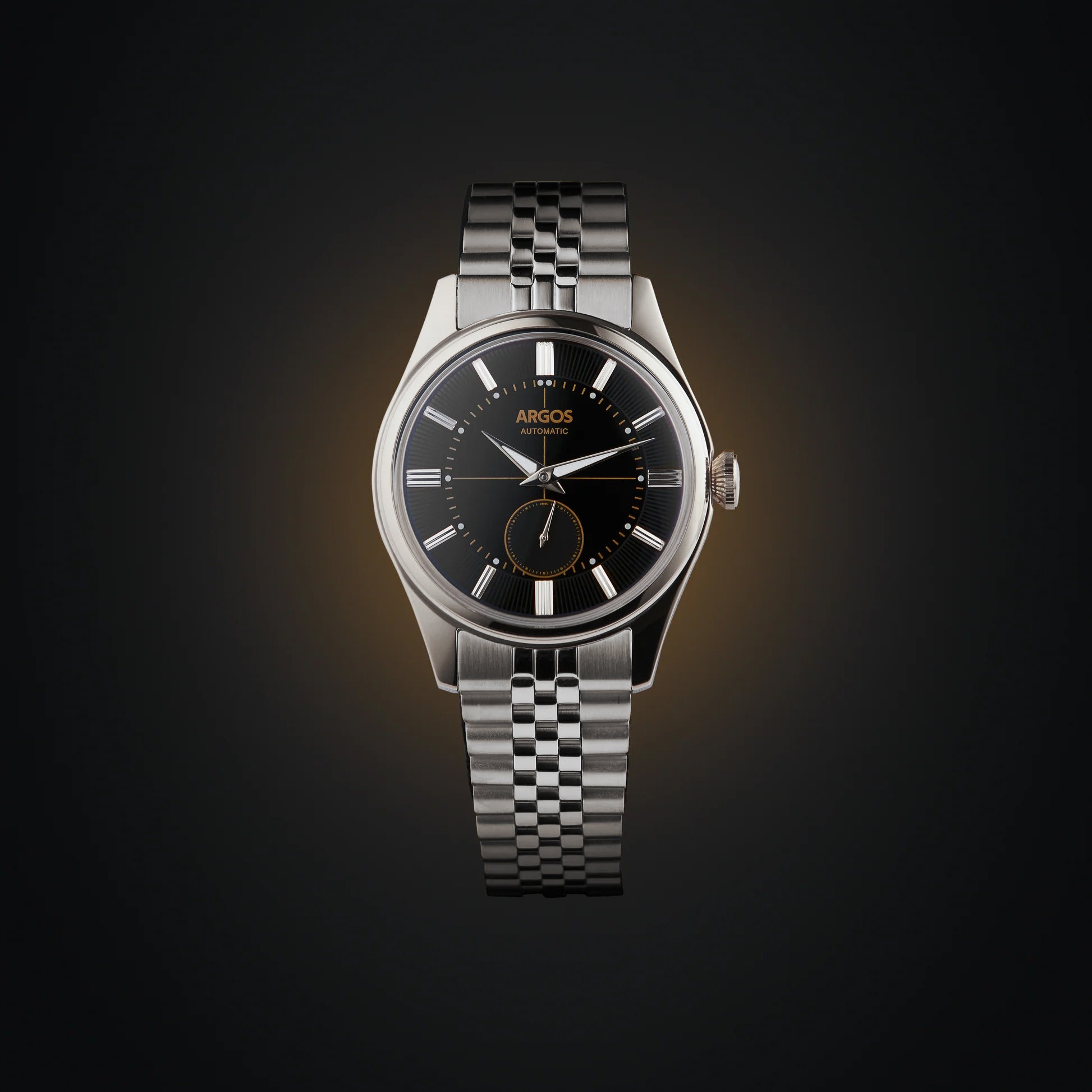 The Argos Apollo III elevates your everyday elegance. Its automatic movement ensures effortless precision, while the vibrant neo-vintage dial and luminous accents captivate the eye. The Italian suede strap with the butterfly buckle or the 5 Row Solid Link Jubilee Bracelet offer a touch of timeless sophistication, complemented by the virtually scratch-proof sapphire coated crystal.