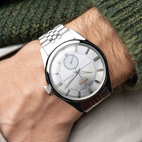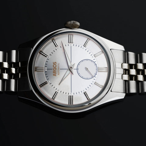 The Argos Apollo III elevates your everyday elegance. Its automatic movement ensures effortless precision, while the vibrant neo-vintage dial and luminous accents captivate the eye. The Italian suede strap with the butterfly buckle or the 5 Row Solid Link Jubilee Bracelet offer a touch of timeless sophistication, complemented by the virtually scratch-proof sapphire coated crystal.