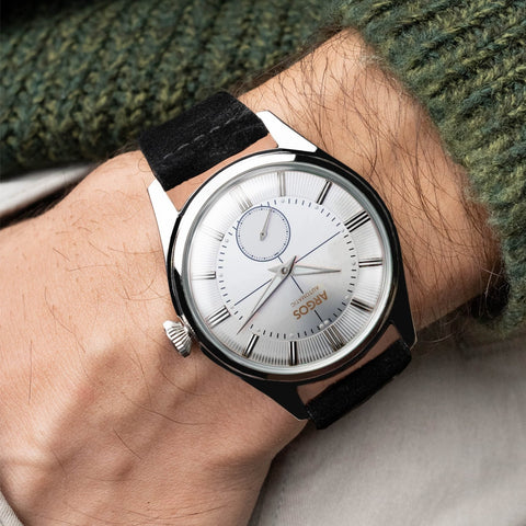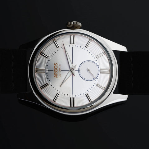 The Argos Apollo III elevates your everyday elegance. Its automatic movement ensures effortless precision, while the vibrant neo-vintage dial and luminous accents captivate the eye. The Italian suede strap with the butterfly buckle or the 5 Row Solid Link Jubilee Bracelet offer a touch of timeless sophistication, complemented by the virtually scratch-proof sapphire coated crystal.