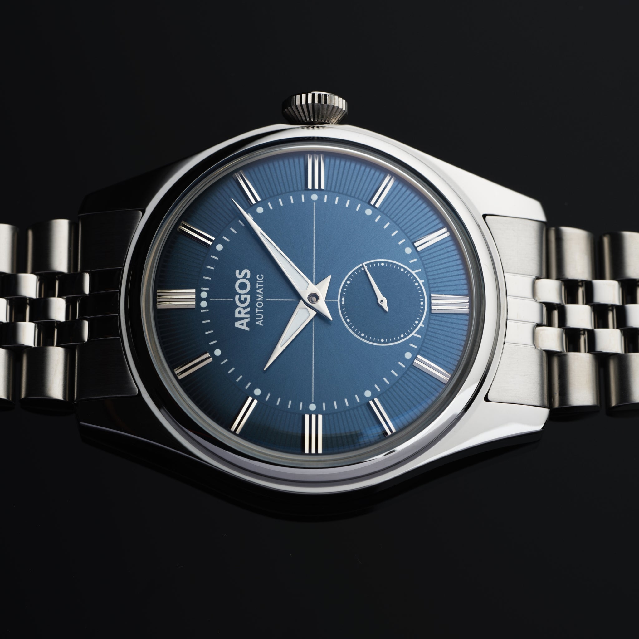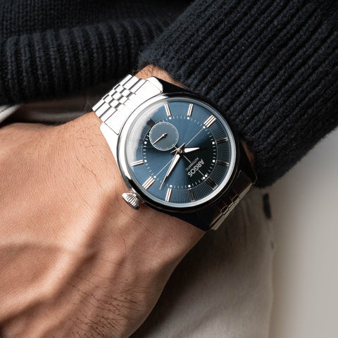 The Argos Apollo III elevates your everyday elegance. Its automatic movement ensures effortless precision, while the vibrant neo-vintage dial and luminous accents captivate the eye. The Italian suede strap with the butterfly buckle or the 5 Row Solid Link Jubilee Bracelet offer a touch of timeless sophistication, complemented by the virtually scratch-proof sapphire coated crystal.