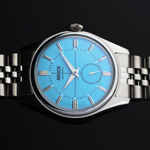 The Argos Apollo III elevates your everyday elegance. Its automatic movement ensures effortless precision, while the vibrant neo-vintage dial and luminous accents captivate the eye. The Italian suede strap with the butterfly buckle or the 5 Row Solid Link Jubilee Bracelet offer a touch of timeless sophistication, complemented by the virtually scratch-proof sapphire coated crystal.