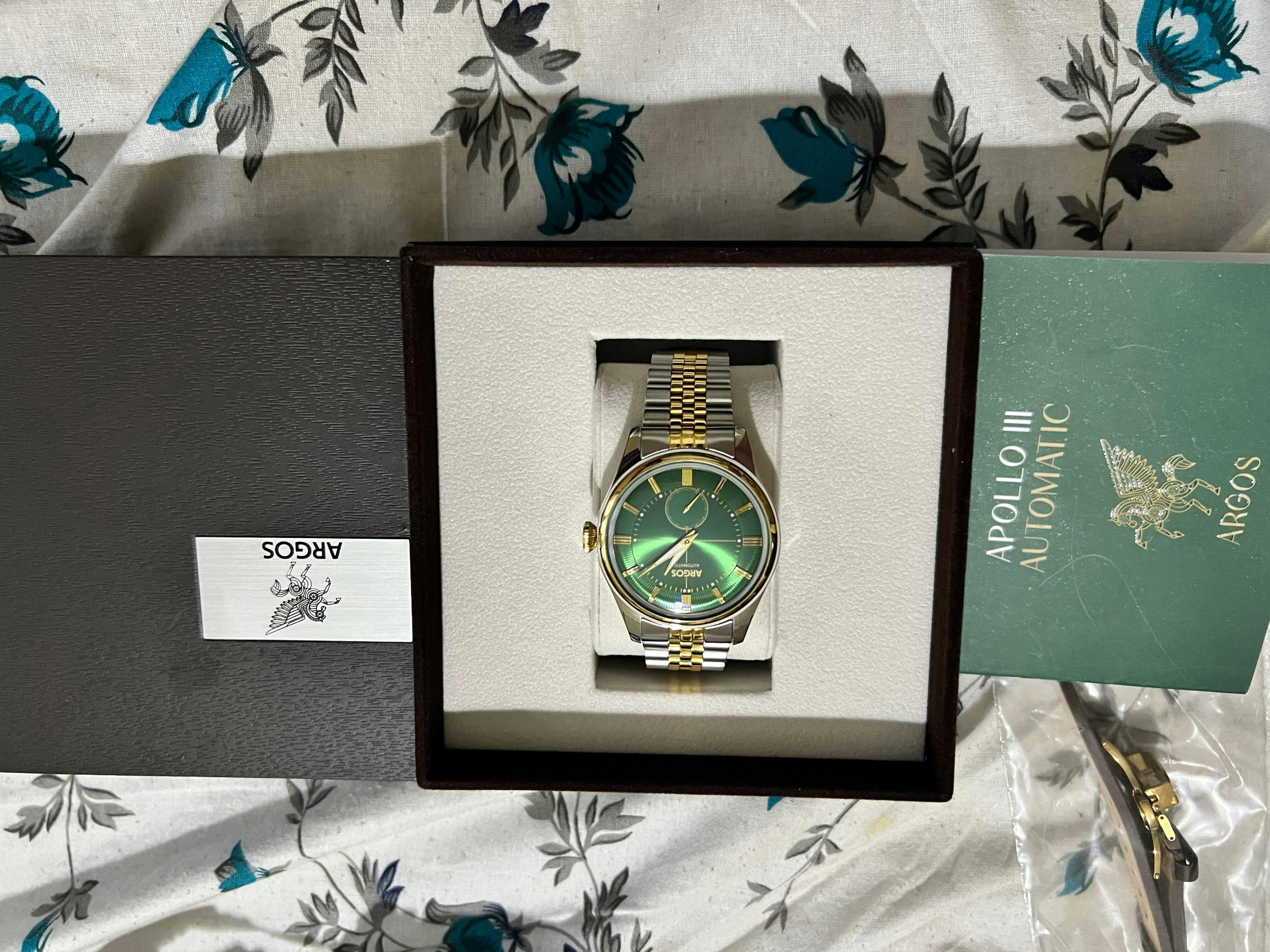 The Argos Apollo III elevates your everyday elegance. Its automatic movement ensures effortless precision, while the vibrant sunburst dial and luminous accents captivate the eye. The Italian suede strap with the butterfly buckle or the 5 Row Solid Link Jubilee Bracelet offer a touch of timeless sophistication, complemented by the virtually scratch-proof sapphire coated crystal.