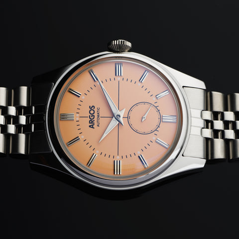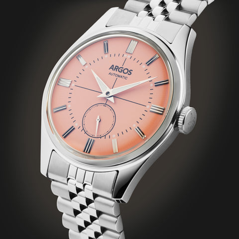 The Argos Apollo III elevates your everyday elegance. Its automatic movement ensures effortless precision, while the vibrant neo-vintage dial and luminous accents captivate the eye. The Italian suede strap with the butterfly buckle or the 5 Row Solid Link Jubilee Bracelet offer a touch of timeless sophistication, complemented by the virtually scratch-proof sapphire coated crystal.