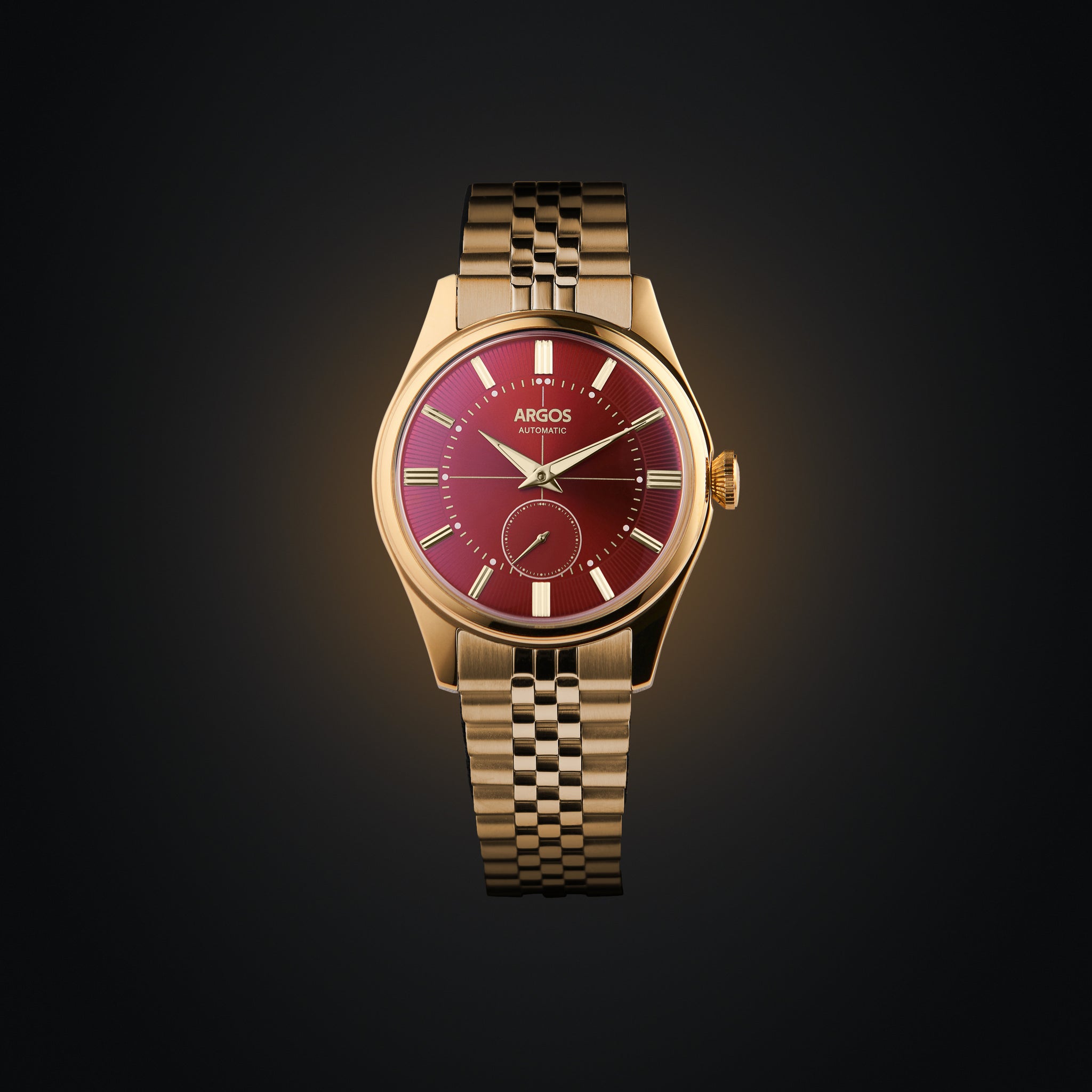 The Argos Apollo III elevates your everyday elegance. Its automatic movement ensures effortless precision, while the vibrant neo-vintage dial and luminous accents captivate the eye. The Italian suede strap with the butterfly buckle or the 5 Row Solid Link Jubilee Bracelet offer a touch of timeless sophistication, complemented by the virtually scratch-proof sapphire coated crystal.