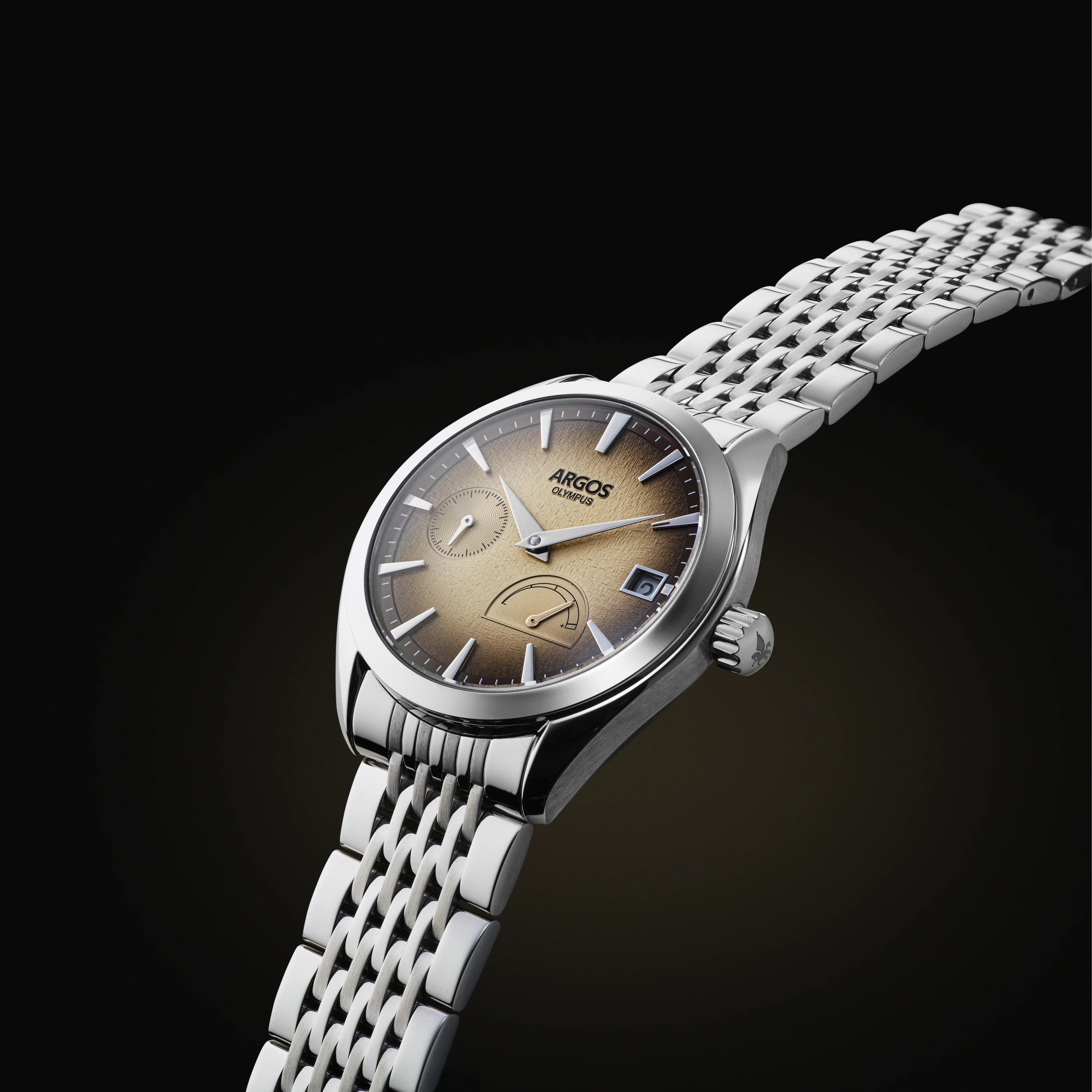 The Argos Olympus fuses refined style with mechanical heart - housed in a 316L stainless steel case, sporting a stunning textured dial, and a nine-row solid-link bracelet or an Italian Suede Leather Strap that radiates quiet luxury.