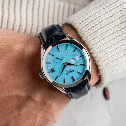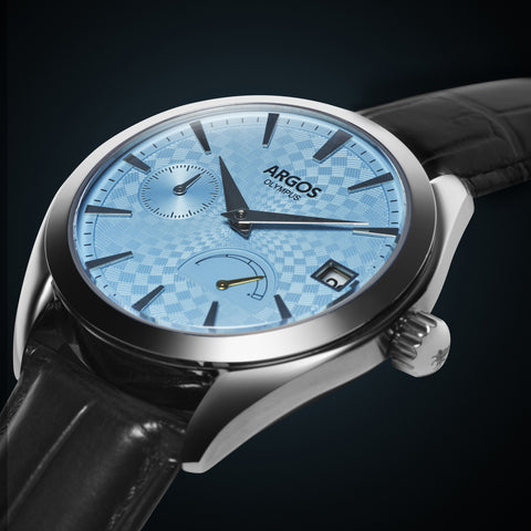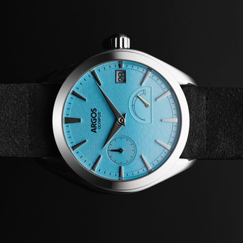 The Argos Olympus fuses refined style with mechanical heart - housed in a 316L stainless steel case, sporting a stunning textured dial, and a nine-row solid-link bracelet or an Italian Suede Leather Strap that radiates quiet luxury.