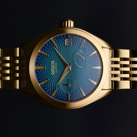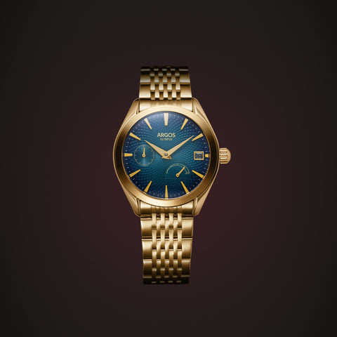 The Argos Olympus fuses refined style with mechanical heart - housed in a 316L stainless steel case, sporting a stunning textured dial, and a nine-row solid-link bracelet or an Italian Suede Leather Strap that radiates quiet luxury.