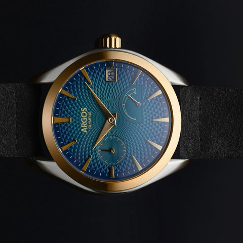 The Argos Olympus fuses refined style with mechanical heart - housed in a 316L stainless steel case, sporting a stunning textured dial, and a nine-row solid-link bracelet or an Italian Suede Leather Strap that radiates quiet luxury.