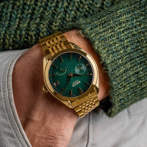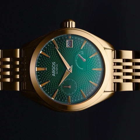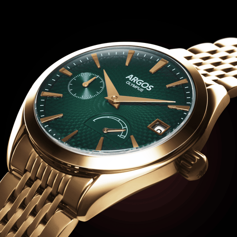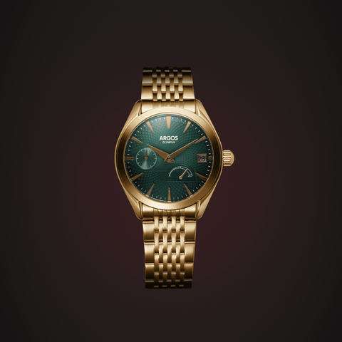 The Argos Olympus fuses refined style with mechanical heart - housed in a 316L stainless steel case, sporting a stunning textured dial, and a nine-row solid-link bracelet or an Italian Suede Leather Strap that radiates quiet luxury.