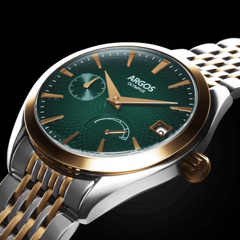 The Argos Olympus fuses refined style with mechanical heart - housed in a 316L stainless steel case, sporting a stunning textured dial, and a nine-row solid-link bracelet or an Italian Suede Leather Strap that radiates quiet luxury.