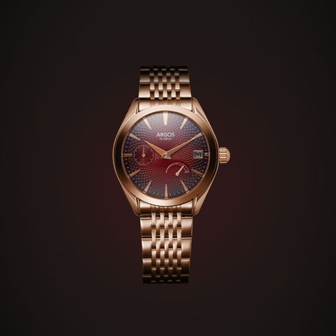 The Argos Olympus fuses refined style with mechanical heart - housed in a 316L stainless steel case, sporting a stunning textured dial, and a nine-row solid-link bracelet or an Italian Suede Leather Strap that radiates quiet luxury.