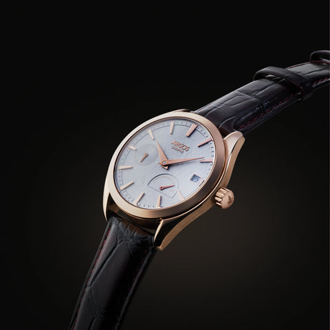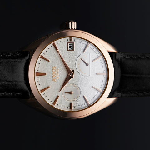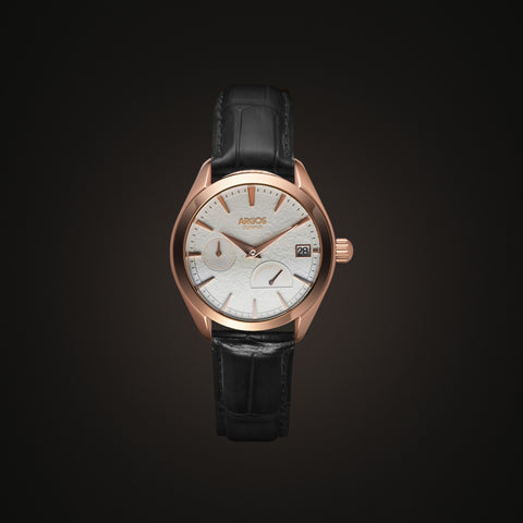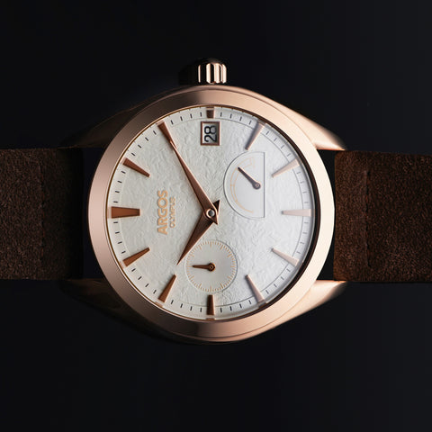 The Argos Olympus fuses refined style with mechanical heart - housed in a 316L stainless steel case, sporting a stunning textured dial, and a nine-row solid-link bracelet or an Italian Suede Leather Strap that radiates quiet luxury.