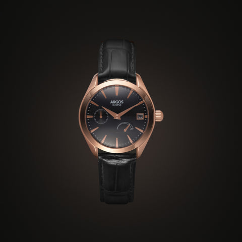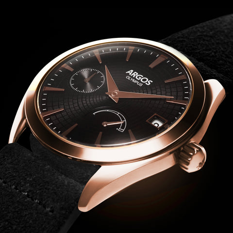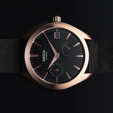 The Argos Olympus fuses refined style with mechanical heart - housed in a 316L stainless steel case, sporting a stunning textured dial, and a nine-row solid-link bracelet or an Italian Suede Leather Strap that radiates quiet luxury.